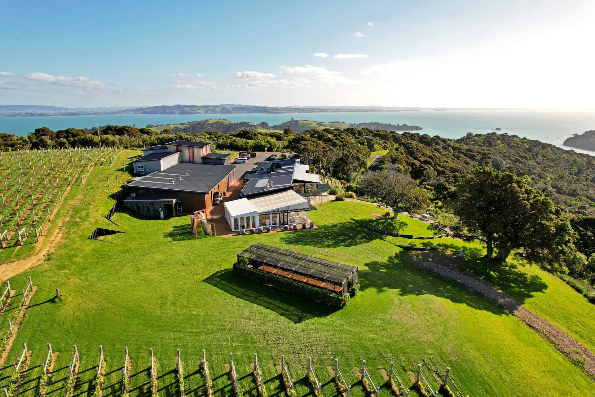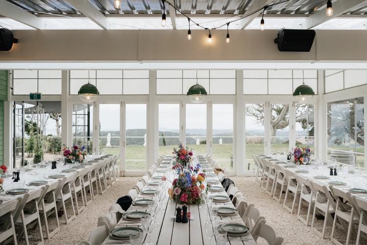 The main pavilion, with its floor-to-ceiling windows and wraparound deck, captures those golden hour views that make Waiheke weddings legendary.